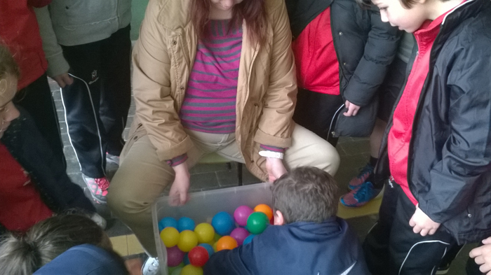 4. En una caja llena de pelotas de colores debías encontrar una pelota que tiene un cascabel en su interior con los ojos cerrados.