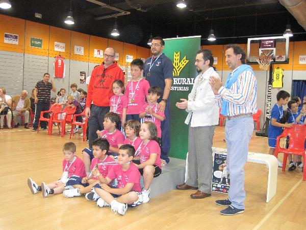 3º y 4º Baby: 11:00h. Colegio Loyola A 37-28 Centro Asturiano de Oviedo La mañana comenzó con el partido por el 3º y 4º puesto, a las 11:00h.se incio el partido entre del Colegio Loyola A ( equipo naranja ) y el CAO. El partido estuvo muy igualado en sus inicios donde el intercambio de canastas era constante y la fluidez en el juego la tónica dominante del encuentro. Sin embargo, a medida que avanzaba el partido fueron los pupilos de Chanel Schockaert los que se fueron distanciando en el marcador gracias a su mayor presencia física y las segundas oportunidades de tiro al dominar el rebote. CAO intentaba no perder de vista el partido con rápidos contrataques que no permitiera alejarse a su rival pero no fue posible. Al final victoria del Colegio Loyola A que alcanzaba la tercera plaza y el CAO se hacía con la cuarta. |