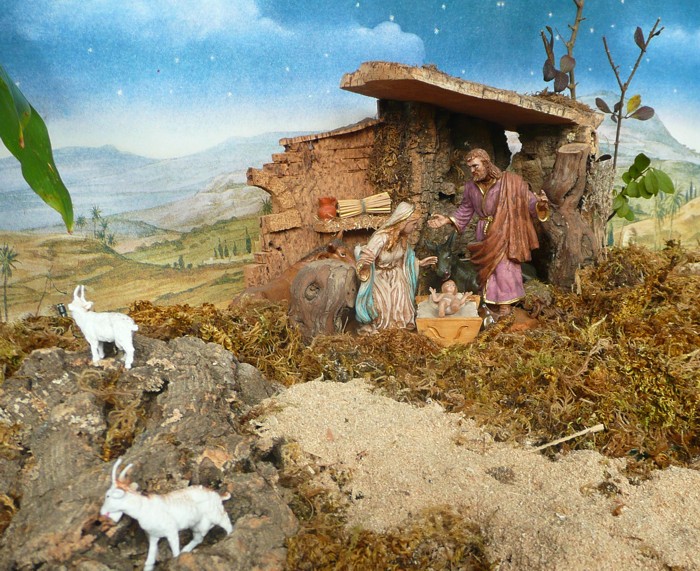 Detalle del portal. La virgen María, José y el niño en la cuna con el buey y la mula observando. |