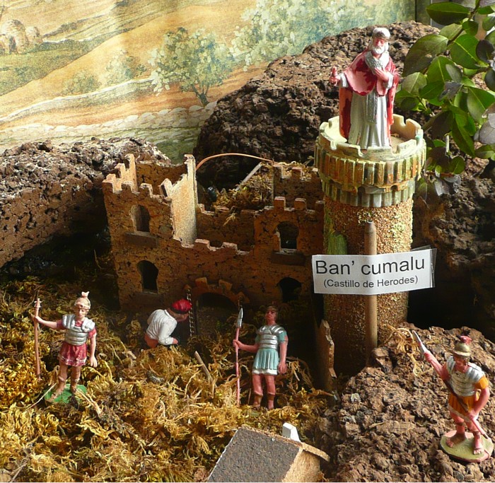 Herodes en lo alto de la torre de su castillo oteando el horizonte. Los soldados vigilantes no pueden evitar al campesino que se alivia al lado de la puerta del castillo. |