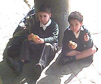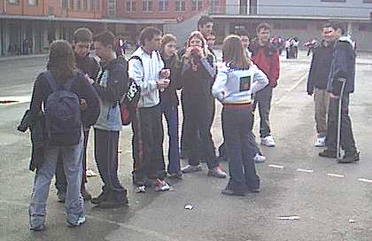 Caminando por el patio charlando sobre lo que significa la operación bocata o no. |