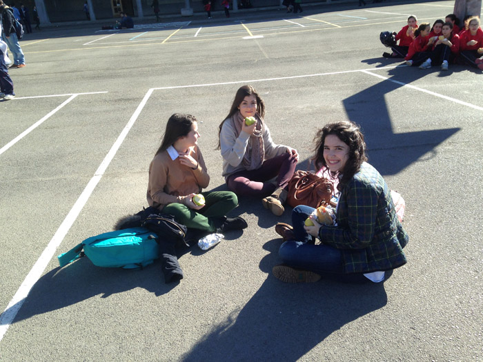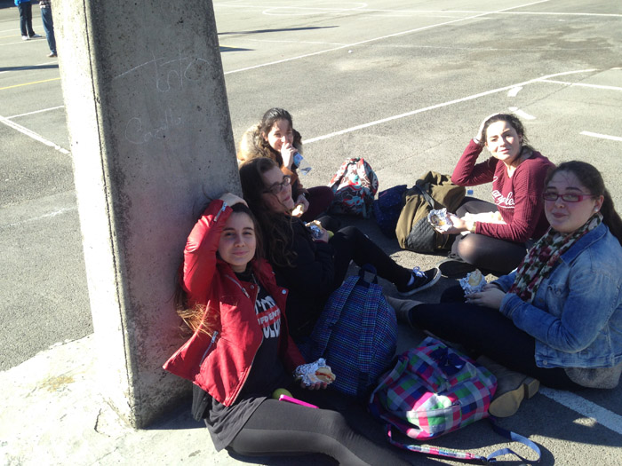 Por todas partes grupos de alumnos se sentaban para comer tranquilamente.