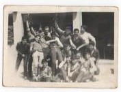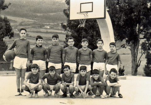 Equipo baloncesto 1964 en cancha fuera antigua, la que estaba mas cerca de la fuente y al fondo los eucaliptos gigantes que se enrraizaban en el vertedorio.