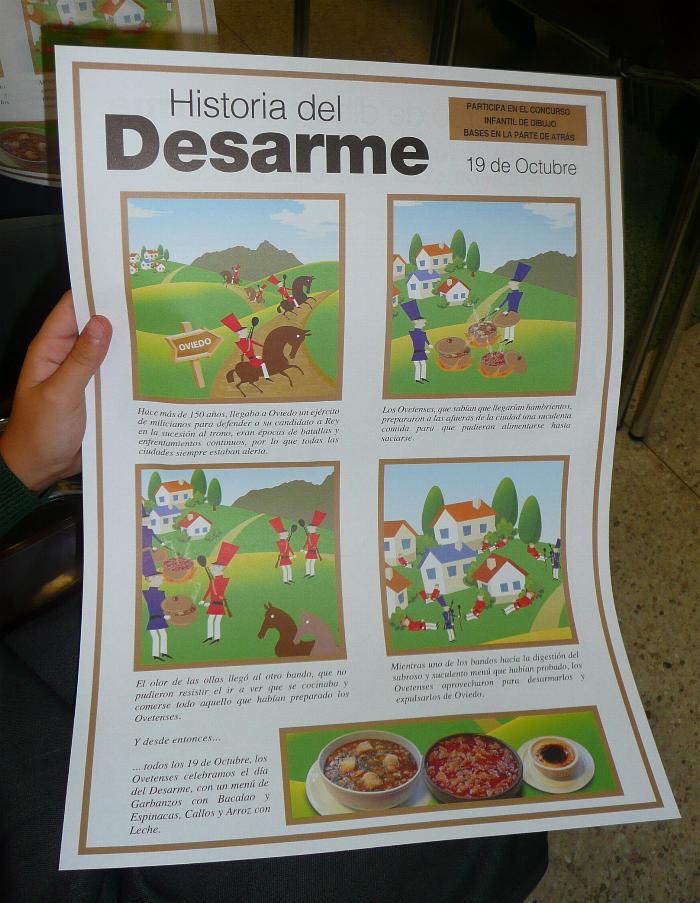 En la Nueva España (ver) del 1 de Noviembre salió una reseña sobre los premios y de Raúl decía: Raúl Siero González, del colegio Loyola, se alzó con el segundo puesto y logró un patinete. Este estudiante de tercero de Primaria, "de tercero A", puntualiza, no puede esperar para estrenar su regalo. "Iré mañana (por hoy) a estrenarlo", señala mientras busca con la mirada la aprobación de su madre. Ayer ya se había hecho un poco tarde. Gran aficionado a la pintura, reconoce que era la primera vez que participaba en un concurso de dibujo. Casi fue llegar y besar el santo. "En el cole me explicaron la historia del Desarme, y yo decidí pintar a los del bando de Oviedo lanzando a sus enemigos, que están con la lengua fuera, platos de comida", comenta el pequeño, orgulloso de su obra.