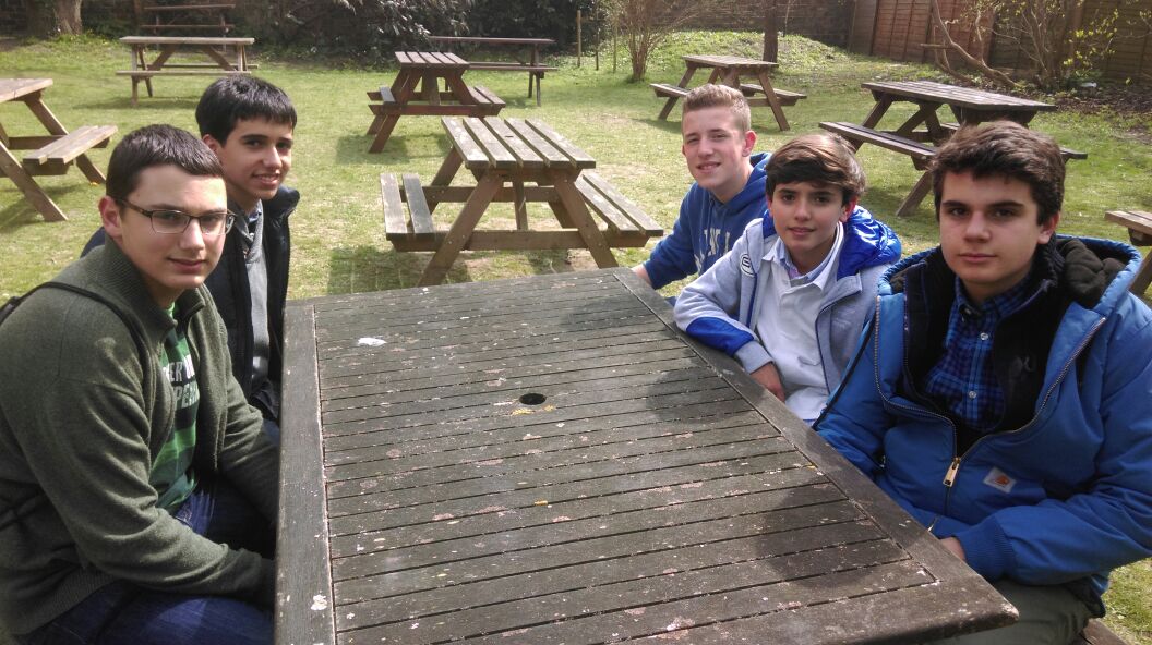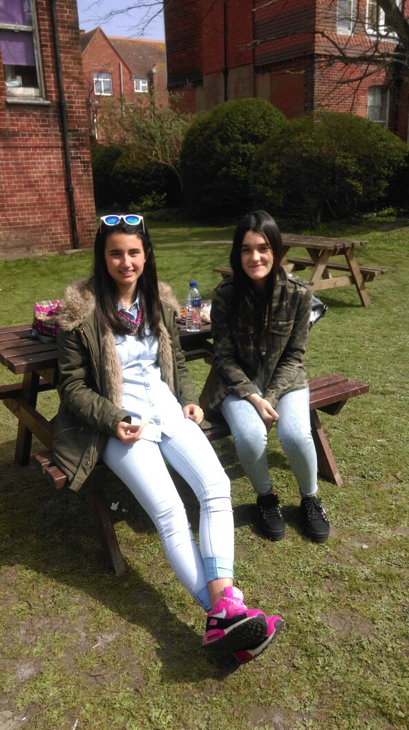 A las 10:30 h. tienen el primer "break" y nos hemos sacado está foto a la puerta (Twin English Centre, Eastbourne).