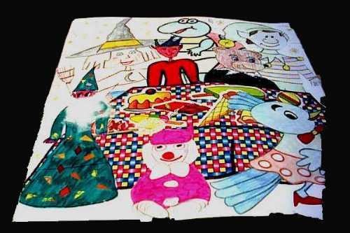 Y llegó por fín el momento de la fiesta ¡Qué alegría! Estaban todos los invitados. Había golosinas, globos y serpentinas, matasuegras y la mesa llena de riquísima comida. Todos habían trabajado en equipo y lo habían conseguido. Allí estaban Popi, la tortuga Tatú, la bruja Piruja, el mago Cirilón, la mamá Osa, el duende Golosín, el duende Cascabel y Ramona la paloma, y... pero un momento ¿dónde está el lápiz mágico? Oh, no... |