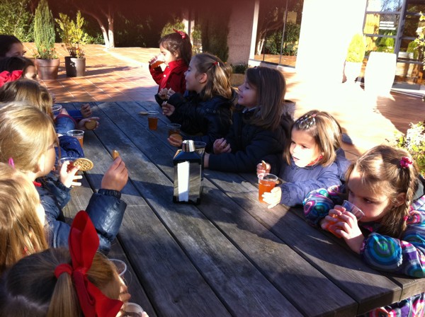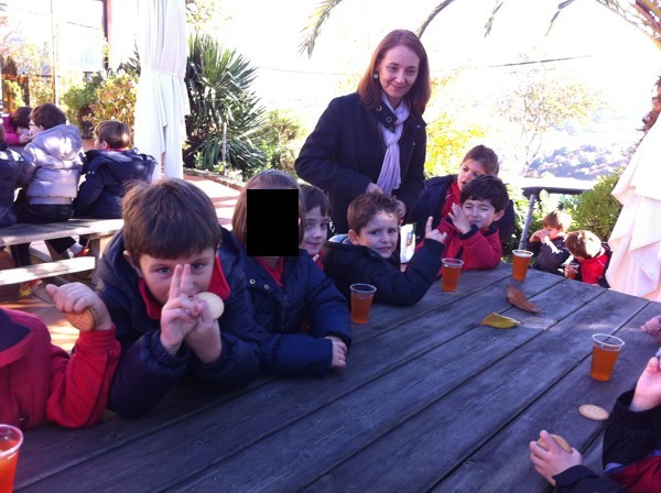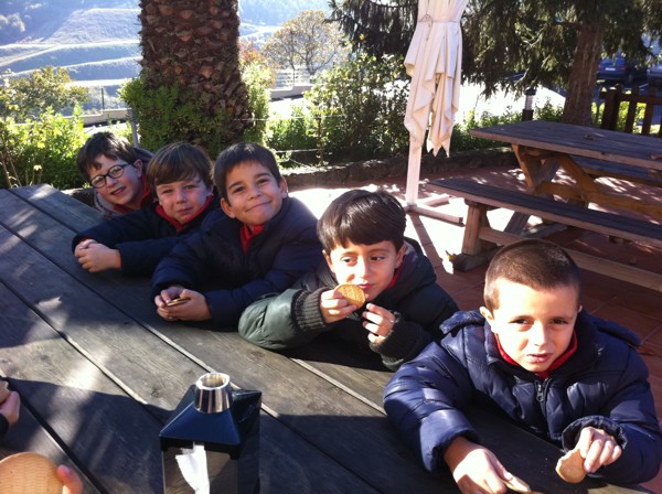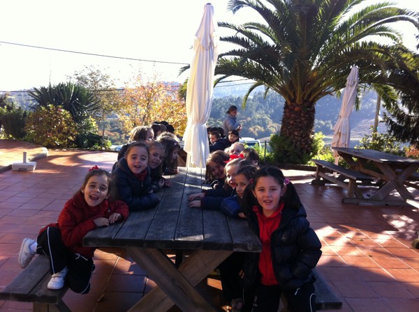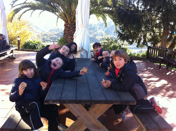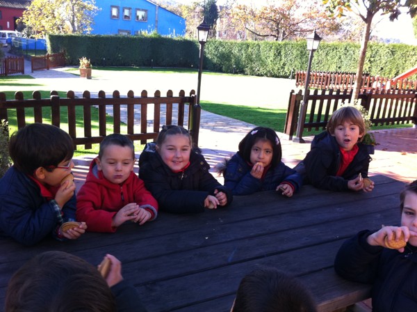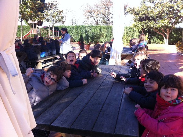 Sentados alrededor de la mesa con nuestros compañeros del cole. |