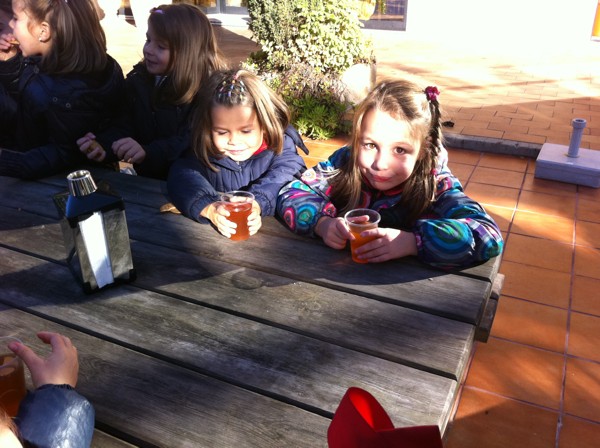 Un par de colegas tomando un vasín de sidra dulce. |