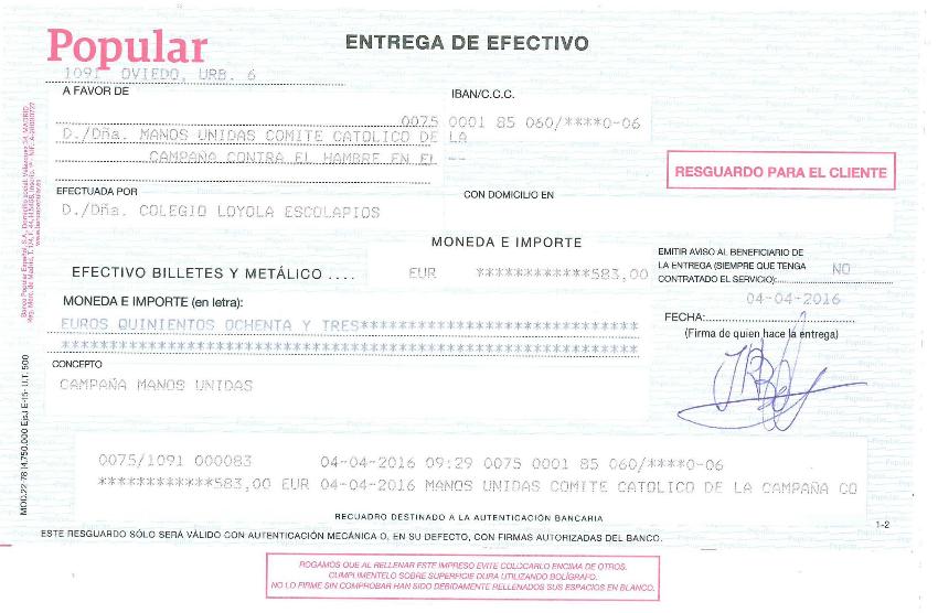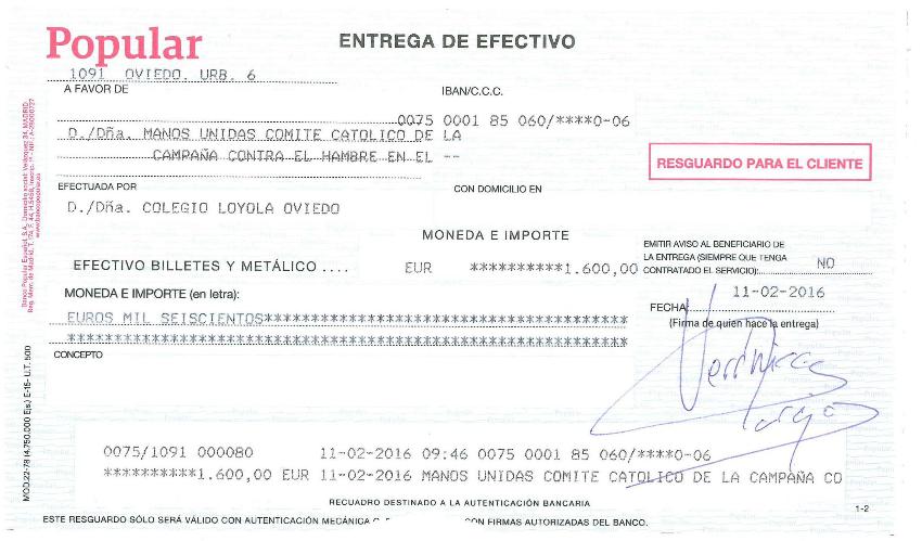 Hemos recaudado 2.183 euros que ya están ingresados en la cuenta de Manos Unidas.