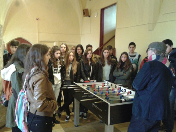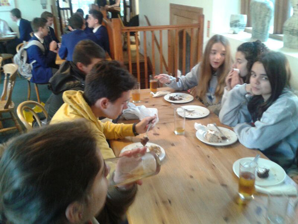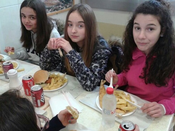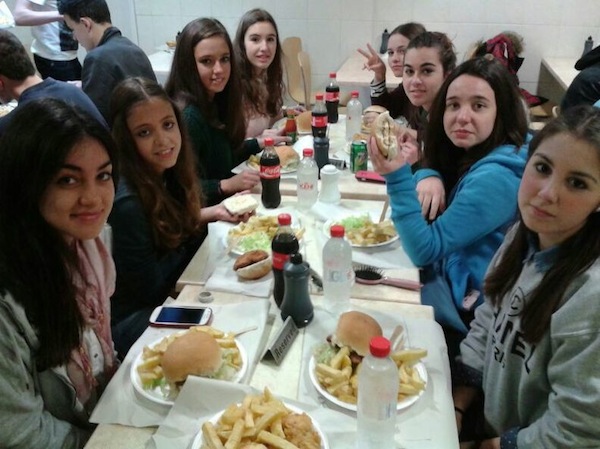 Tour por el colegio, luego a clase, tiempo libre o concurso, lunch, bolos y vuelta al cole a las 15:55 h. a reunirse con sus compañeros ingleses.