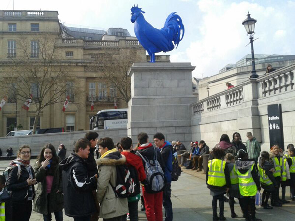 Una escultura azul grande de un cockerell ocupa el cuarto pedestal en Trafalgar Square, y no podíamos dejar pasar la ocasión de hacernos una foto a su lado.