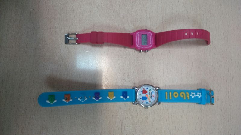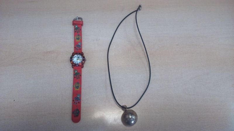 Otro reloj y un colgante con una bola con ruido en su interior.
