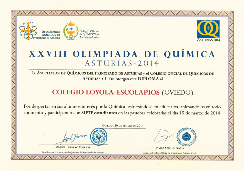 El jueves 20 de marzo de 2014 en el Auditorio Príncipe Felipe de Oviedo a las 19:00 h. se entregaron los diplomas y premios correspondientes a la XXVIII Olimpiada de Química - Asturias 2014.