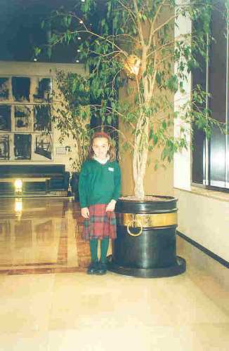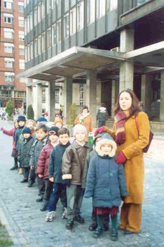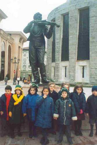 Ya llegamos a la plaza de la Gesta. Arriba estamos en fila muy ordenaditos con la seño. Aquí al lado posamos ante el violinista. |