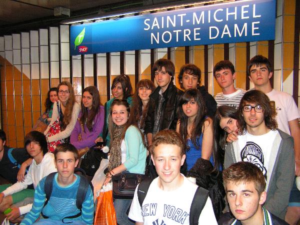 A las 12.00 horas embarcamos en el RER (tren de cercanías de París, pero que atraviesa la ciudad en sus tres líneas habitualmente en larguísimos convoyes de vagones de dos pisos) con dirección a la zona del Boulevard Saint Michel y el barrio latino, para comer allí. Decidimos repetir zona puesto que el otro día les gustó mucho, pudieron comer por un buen precio, pero no dispusieron de mucho tiempo para recorrer el barrio. |