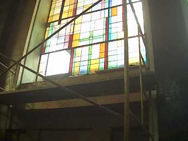 El día 11 de octubre de 1962 a las cinco y media de la tarde fué el momento en el que se procedió a la bendición de la Iglesia del Colegio. Ese mismo día en Roma se produjo la apertura del Concilio Vaticano II. Los años van pasando, la Iglesia sigue ahí. Algunos pequeños cambios, entre los que está la instalación de la tarima que hace posible las representaciones, festivales... en definitiva que hace posible el uso de la Iglesia también como Salón de Actos. Uno de los elementos más llamativos para todos los que visitan la Iglesia sin duda son las vidrieras, pero también son las más delicadas. Las vidrieras sufren las inclemencias del tiempo, las varillas de plomo que sujetan los vidrios de colores se van soltando y eso hace que los cristales terminen por romperse. Hoy cuando se cumplen 40 años de su instalación, Miguel, encargado del mantenimiento del colegio, comienza la restauración de las vidrieras e incluso en algunos casos más extremos de hacerlas de nuevo. |