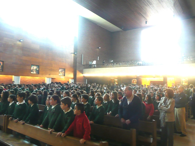 Si miráis el escudo que lleváis en el pecho veréis el escudo escolapio. Las letras A y M, de María, dentro de un círculo que representa al sol. Para llegar al sol, que es Cristo, hay que pasar por María; para descubrir la presencia de María, es necesario estar iluminados por el sol que es Jesucristo.
